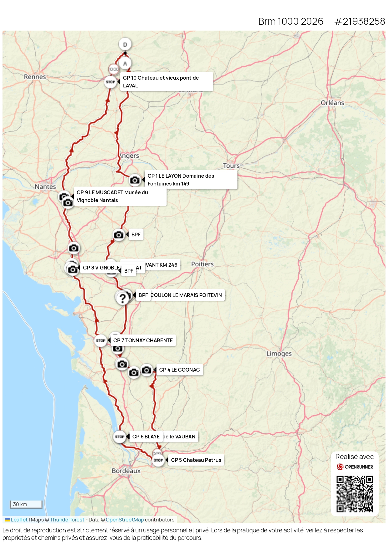 - Organisation BRM 1000 sur la route des vignobles le 20 aout 2026 Départ: à 16h au Stade municipal Claude Leblanc, Avenue Gutenberg à Mayenne Parking disponible – Pot d’accueil – Carton de pointage Parcours en autonomie totale et uniquement par trace GPS Difficulté du dénivelé: D+7500 – Pointage par tampon humide et photos Ravitaillement à l’arrivée – Douche possible Contact: francoismouezy@orange.fr – tél: 06 19 27 37 70