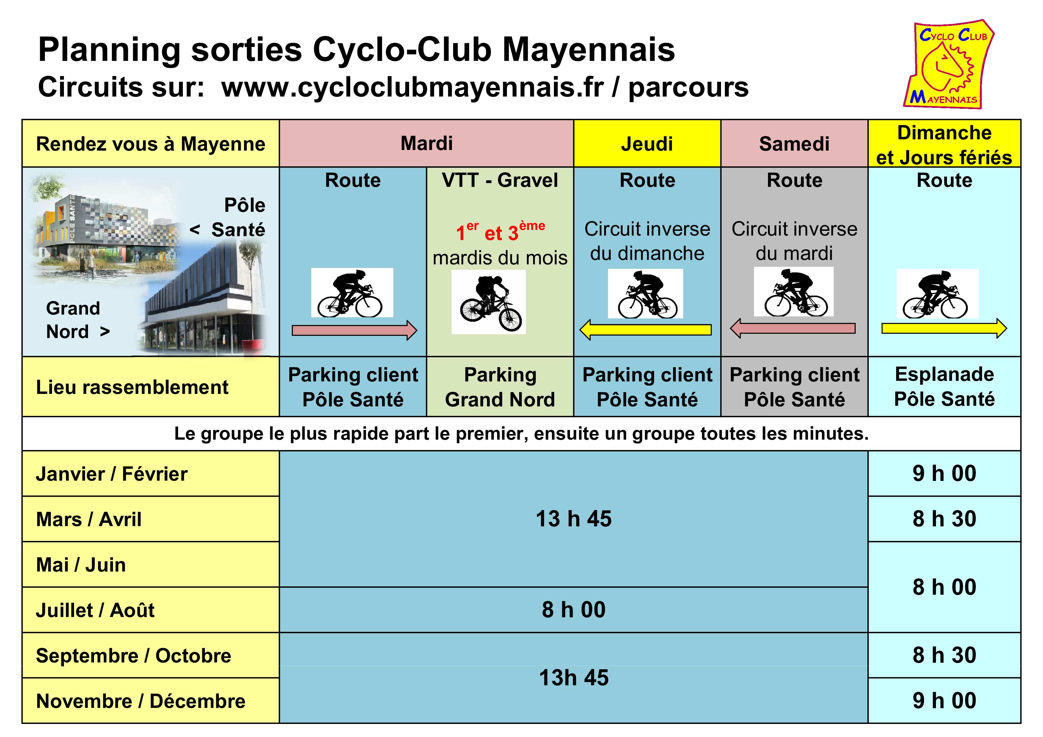 Regroupement derrière pôle santé, parking clientèle les mardi et jeudi, sur l’esplanade du pôle santé, le dimanche matin. Au Grand Nord pour VTT/Gravel