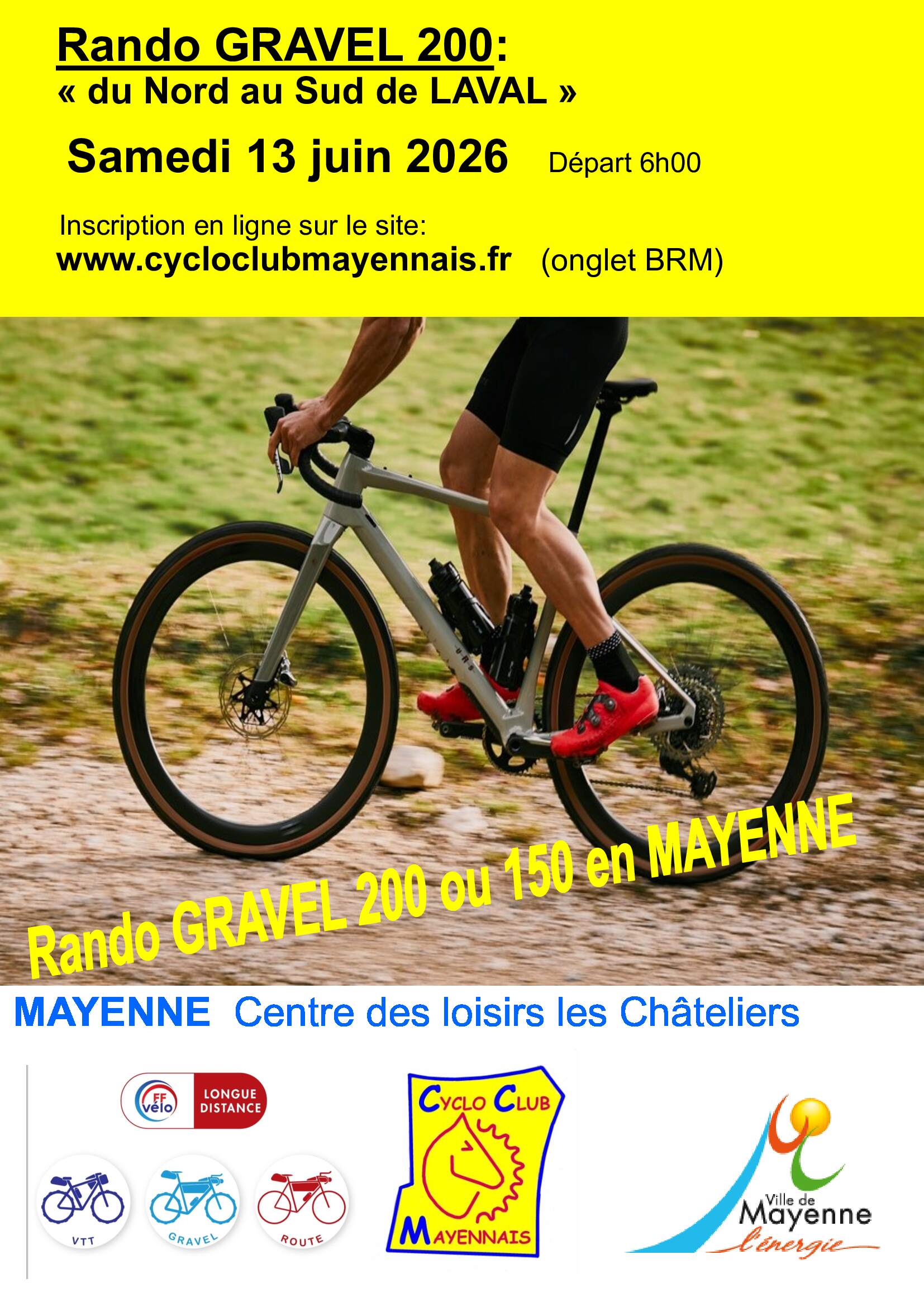 Départ 6H . Centre des loisirs des Châteliers MAYENNE Parking disponible – Pot d’accueil Parcours en autonomie total et uniquement par trace GPX Difficulté du dénivelé 1553m pour le 200km Ravitaillement à l’arrivée – douche possible